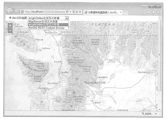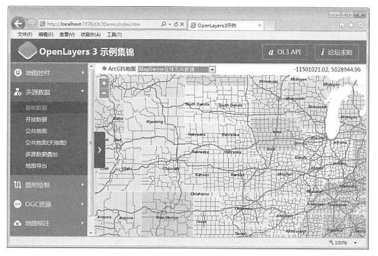 针对ArcGIS数据,OpenLayers3封装了一个ArcGIS瓦片数据源,可以直接使用。同时,可以基于OpenLayers3通用的图层与数据源,加载其瓦片或矢量数据,例如,本示例以加载ArcGIS的数据为例,分别加载ArcGISServer发布的GIS数据服务,以及ArcGISOnline提供的GIS数据服务,如图所示.