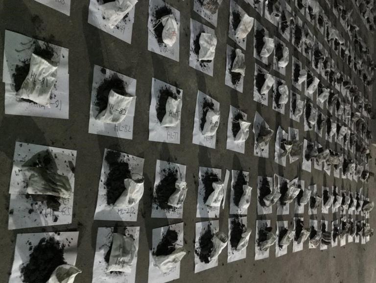 为了全面采集到具有代表性的土壤样品,本次土壤本底值调查在每个示范地块进行空间均匀布点,在每个采样点和周围10米间距范围内,以对角线式五点混合取样。为了在当地春耕前完成采样工作,团队成员克服时间紧、人员有限、地湿难行等困难,分组协作,共同完成海伦示范区土壤样品采集工作。本次共采集土壤样品400余个,土壤采样点干湿状况、作物类型等地理特征填表详细记录,取样处景观及作物品种拍照记录,为土壤本地值调查提供重要参考。