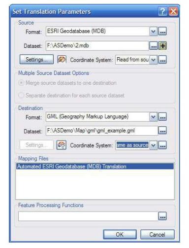 我们可以使用某种ETL工具将我们的地理数据转换为GML格式,如FME Universal Translator,下图是一个将GeoDatabase数据转换为GML的例子。