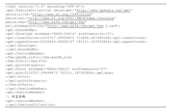 与一般地理数据不同的是,我们可以在一个GML文件中同时保存点、线和而类型的地理实体信息 (包括MultiPolygon、Polygon、MultiLineString、LineString、Multipoint、Point、Envelope和Box八种),这就使得用户能够将要进行交换的地理数据通过一个单独的GML文件提交,而使用者只须通过支持GML的浏览器(如ArcCatalog和FMEUniversalViewer)进行査看。
