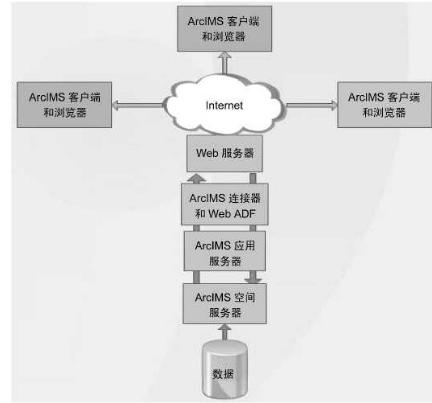ArcIMS是标准的B/S三层架构,由客户端、中间层和服务器层组成,其结构如图所示。