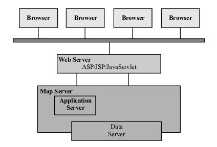 TITANWebServer是东方泰坦科技有限公司开发的WebGIS控件产品,系统采用B/S结构,客户端为通用的Web浏览器,服务器端包括网络服务器和地图服务器两部分。下图列出了TITANWebGIS控件产品的主要结构。TITAN Web Server包括具有地图显示、操作等功能的GIS组件和负责与地图数据服务器进行通信的TConn组件等,用户可以用VB、VC++等任何可嵌入ActiveX控件的编程工具来开发,使用简单、操作方便。TITANWebServer提供建立动态Web页面的能力,使用户可以通过Web浏览器远程访问、査询、显不GIS信息。