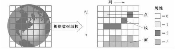 栅格结构是将地理空间分割成规则的网格(一般为矩形方块,特殊情况下也可以是三 角形或菱形、六边形等),在每个网格上给出相极的属性值来表示地理实体的一种数据组织形式,如图所示。每个网格称为一个像元或像素,每个像元的位置由行列号确定,其属性则以代码表示。因此,栅格数据结构中点、线、面等地理实体通过属性代码和行列x、y坐标的形式来表示。